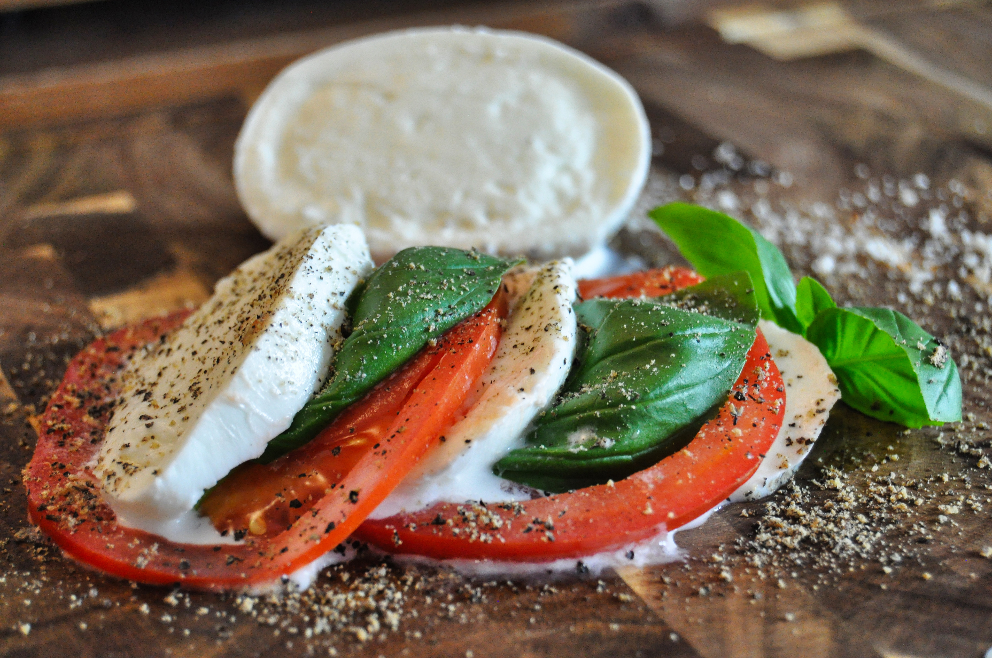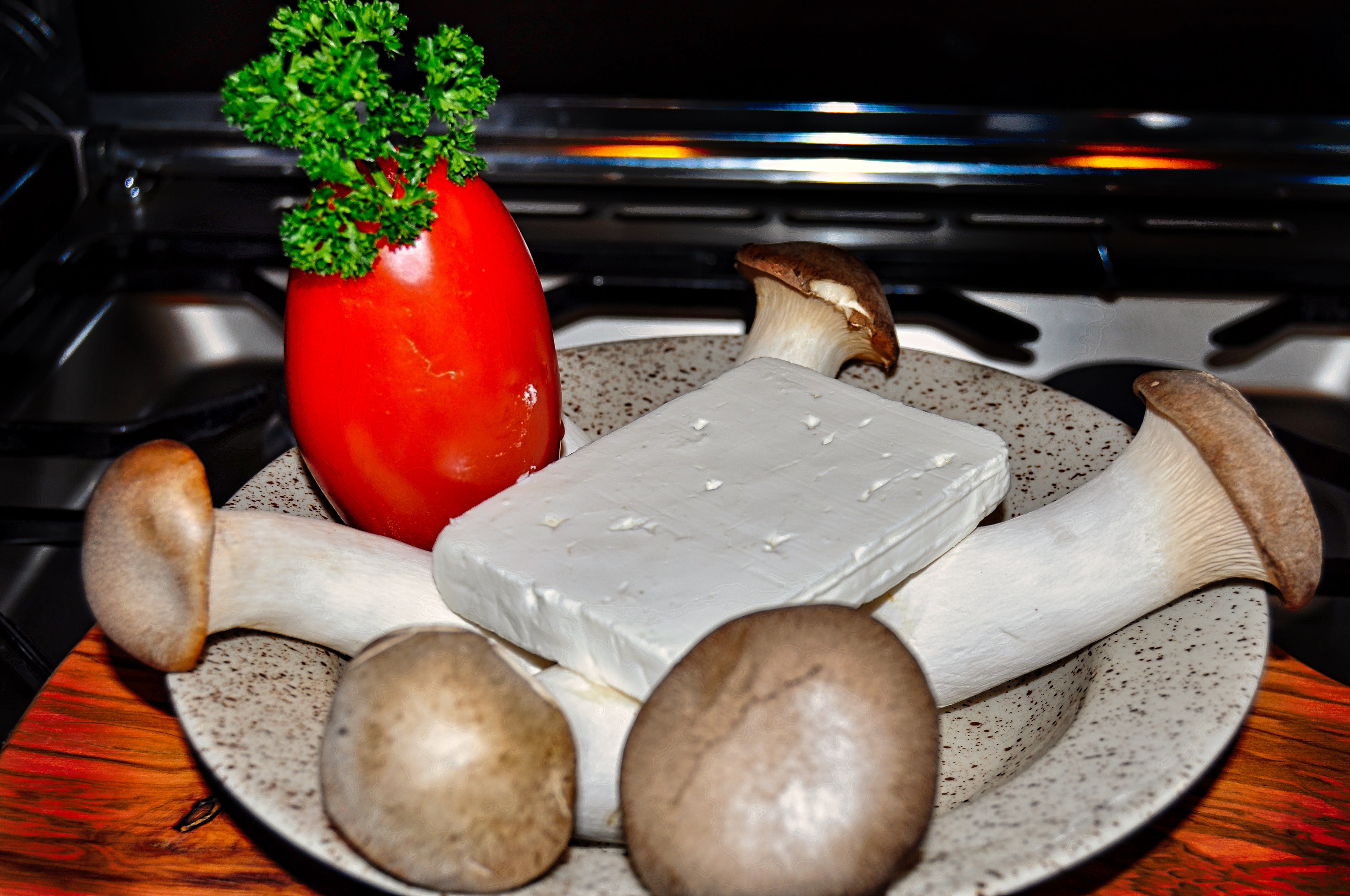 Feta cheese with herb mushrooms and san Marzano tomatoes